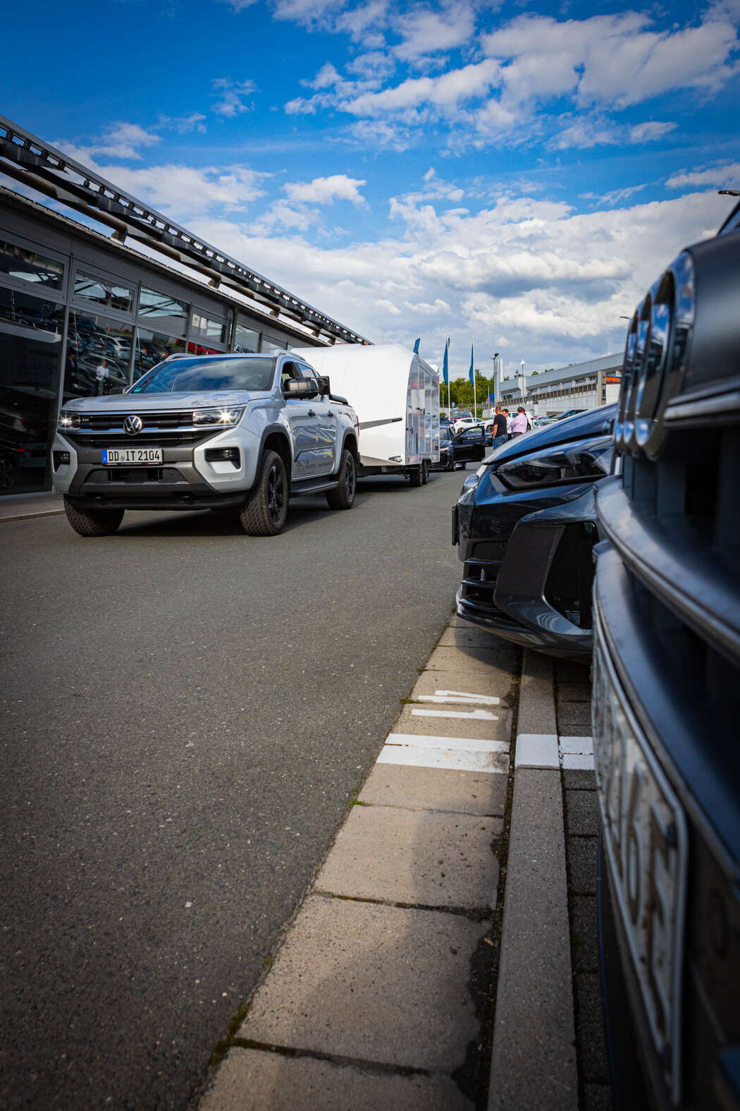 an unserem Standort in Dresden: Den Brian James RT7 in elegantem Weiß und mit einem Amarok als starkes Zugfahrzeug.